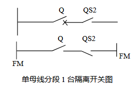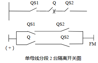 在單母線分段型母線上的線路包括2組隔離開關及1組斷路器。模擬操作中,此模擬開關的機械變位信號經邏輯判斷:如為正常操作,送電時,依次閉合電源側隔離開關QS1、負荷側隔離刀QS2和斷路器Q;停電時,斷路器Q、電源側隔離刀QS1、分負荷側隔離刀QS2。其輸出部分保持低電位不變,不會啟動報警系統;凡不符合上述操作順序的任何操作均屬錯誤操作,其輸出部分FM由低電位變為高電位(+),啟動報警回路動作,發出聲光信號提示操作者。